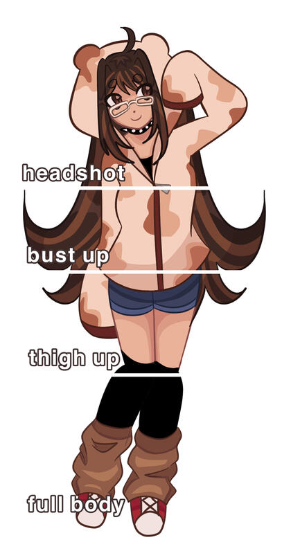step 5. what type of art you’d like (bust up + reference, full body chibi, headshot, etc)